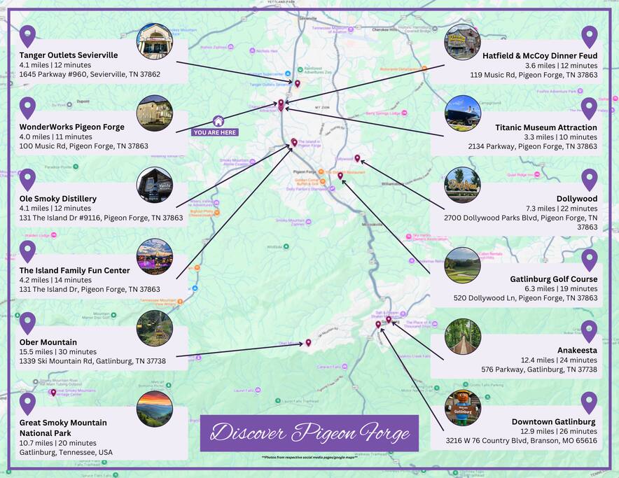 Nestled in the foothills of Bluff mountain and less than 15 minutes from Pigeon Forge, our cabin is perfectly situated for exploring the Smoky Mountains. You’ll be close to all the entertainment, dining, and attractions the area has to offer. Whether you’re browsing local shops, enjoying a great meal, or heading into the Great Smoky Mountains National Park, everything is just a short drive away to make your stay easy and enjoyable. Please note: Uber/Lyft are not readily available in this area, and a car is required. Taxis operate but typically need to be pre-booked.