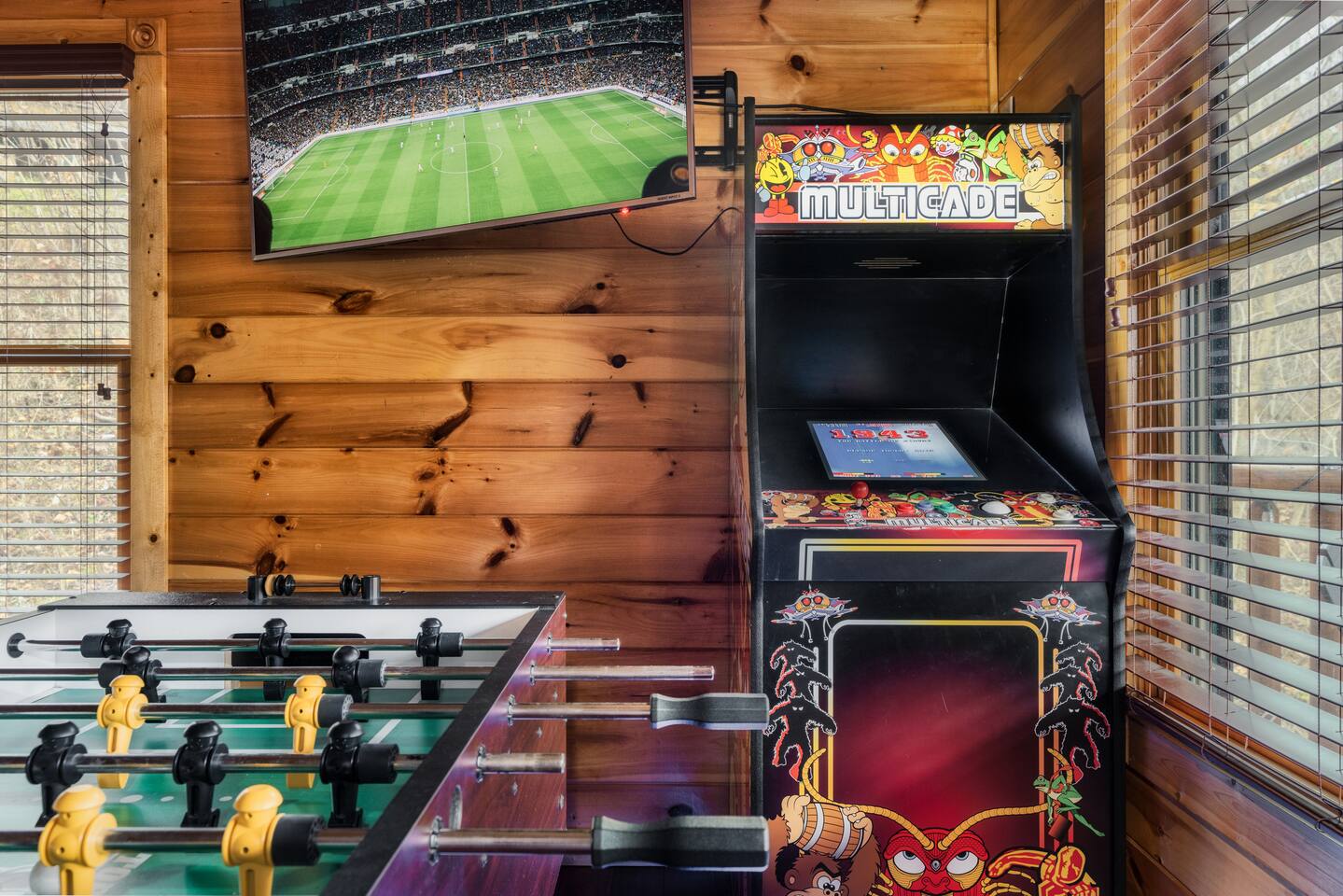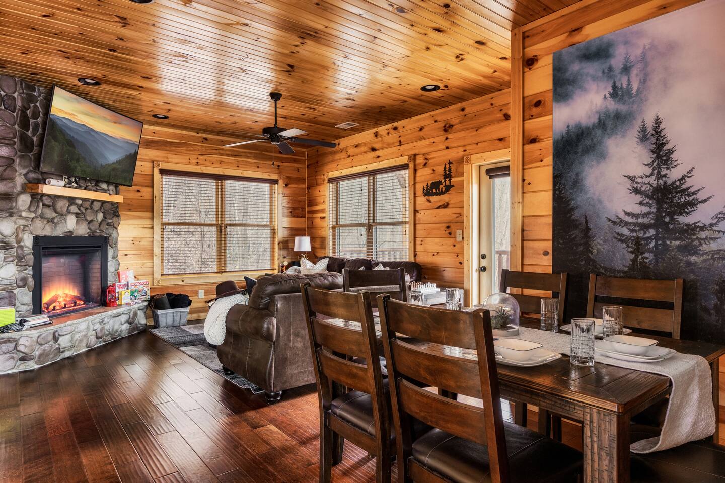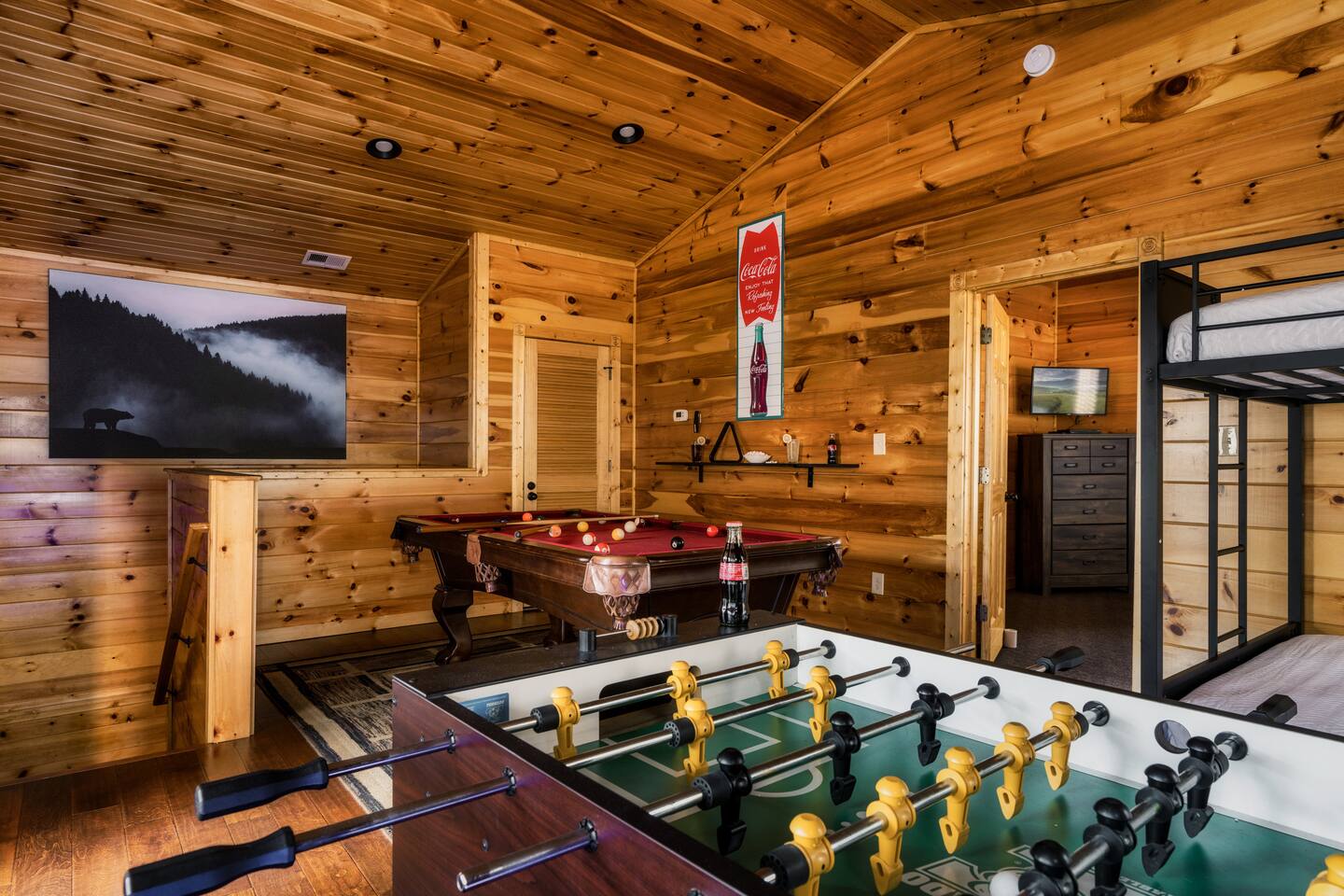 KEY FEATURES: ★ Sleeps 10 (MAX 8 adults) | 2 KING Suites + Full Bunks + Queen Sofa Bed ★ Prime Location: Minutes to Gatlinburg, Pigeon Forge, Smoky Mountains ★ Game Room: Pool Table, Foosball, PAC-MAN Arcade + Toys ★ Hot Tub + Resort Pool + Gym Access ★ Easy Drive (No Steep or Winding Roads) ★ Dedicated Parking for 3 Cars ★ 2 Private Decks: With Mountain + Forest Views ★ Perfect for Multi- Generational Families or Groups ★ Family Friendly: High Chair + Board Games ★ Smart TVs + Free High-Speed WiFi + JBL Stereo ★ Fully Equipped Kitchen & Dining Table ★ Outdoor Charcoal Grill & Outdoor Picnic Table NEARBY ATTRACTIONS: 📍 2.5 mi: Parkway 📍 2.6 mi Anakeesta 📍 3 mi: Downtown Gatlinburg 📍 3.5 mi: Great Smoky Mt National Prk 📍 6.2 mi: Ober Mountain 📍 8 mi: Pigeon Forge 📍 8.3 mi: Gatlinburg Golf Course 📍 9.4 mi: The Island Family Fun Center 📍 9.9 mi: Dollywood 📍 10.9 mi: Titanic Museum 📍 11.2 mi: Wonderworks 📍 12 mi: Tanger Outlets We decorate with a Christmas tree for the holidays, so you can fully enjoy the magic of the season during your stay! ✭✭✭✭✭ “Absolutely perfect mountain getaway — spotless, cozy, and even better than the photos! It felt like our own private retreat tucked away in nature yet close to all the action.” ✭✭✭✭✭ “Amazing cabin with every comfort — from the game room and hot tub to the most relaxing beds! The perfect balance of privacy, warmth, and Smoky Mountain charm.” 🖤 SLEEPING ARRANGEMENTS Sleeps up to 10 guests (maximum 8 adults for comfort). The cabin features two king bedrooms with 4K streaming TVs and private bathrooms — one with a spa tub. The living room includes a queen sofa bed, and the game room has full-size bunk beds (open space, no door). High-quality linens are provided for all beds so you can fall asleep in comfort to the quiet of the mountains and wake up refreshed. 🖤 LIVING ROOM After a day of exploring, cozy up by the fireplace with popcorn and hot cocoa. Play a few rounds of chess, dive into a board game, or unwind with your favorite shows on the smart TV. Prefer music instead? Stream your favorite tunes on the Bluetooth stereo and settle in for a cozy night. (Don’t forget your own streaming logins — no cable TV.) 🖤 GAME ROOM Challenge friends at the pool table or foosball, relive your childhood on the arcade games, stream your favorite shows on the TV, and keep little ones happy with a selection of kids’ toys. 🖤 KITCHEN & DINING The kitchen is fully equipped for group meals and gatherings. It includes two coffee makers — a drip machine with a cone-shaped filter and a Keurig for single cups. The dining table seats up to eight with the extension, and a high chair is available for little ones. A full-size washer and dryer are located in the cupboard just off the kitchen. 🖤 OUTDOOR The property features two decks: The lower deck offers a cozy hangout space with mountain views and a picnic table for outdoor dining. The upper deck is perfect for watching the sunset from the Adirondack chairs with your crew and a few cold brews. A private hot tub is also located here. A charcoal park-style grill sits out front (BYO charcoal). 🖤RESORT AMENITIES Community Pool – A beautifully landscaped outdoor pool that’s perfect for relaxing during the warmer months. Typically open from April 15th through the last weekend of September—although dates can vary according to weather and is at the discretion of the resort management. Pool hours are 9 AM to 9 PM. Fitness Center – Typically open daily from 9 AM to 9 PM. Walking Trails – Meandering scenic paths ideal for a quiet stroll and soaking in the natural mountain beauty. 🖤WELCOME PACK A starter supply of dish and laundry detergent, coffee, hand soap, garbage bags, toilet paper, and paper towels is provided to help you settle in. Guests are responsible for any additional supplies needed during their stay. Book Today & Create Lifelong Memories in the Smokies!! 💫