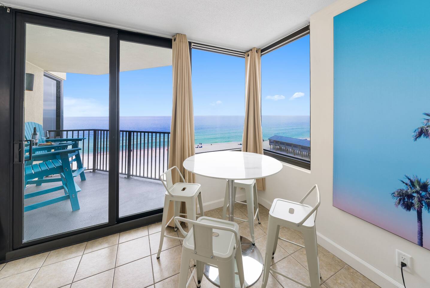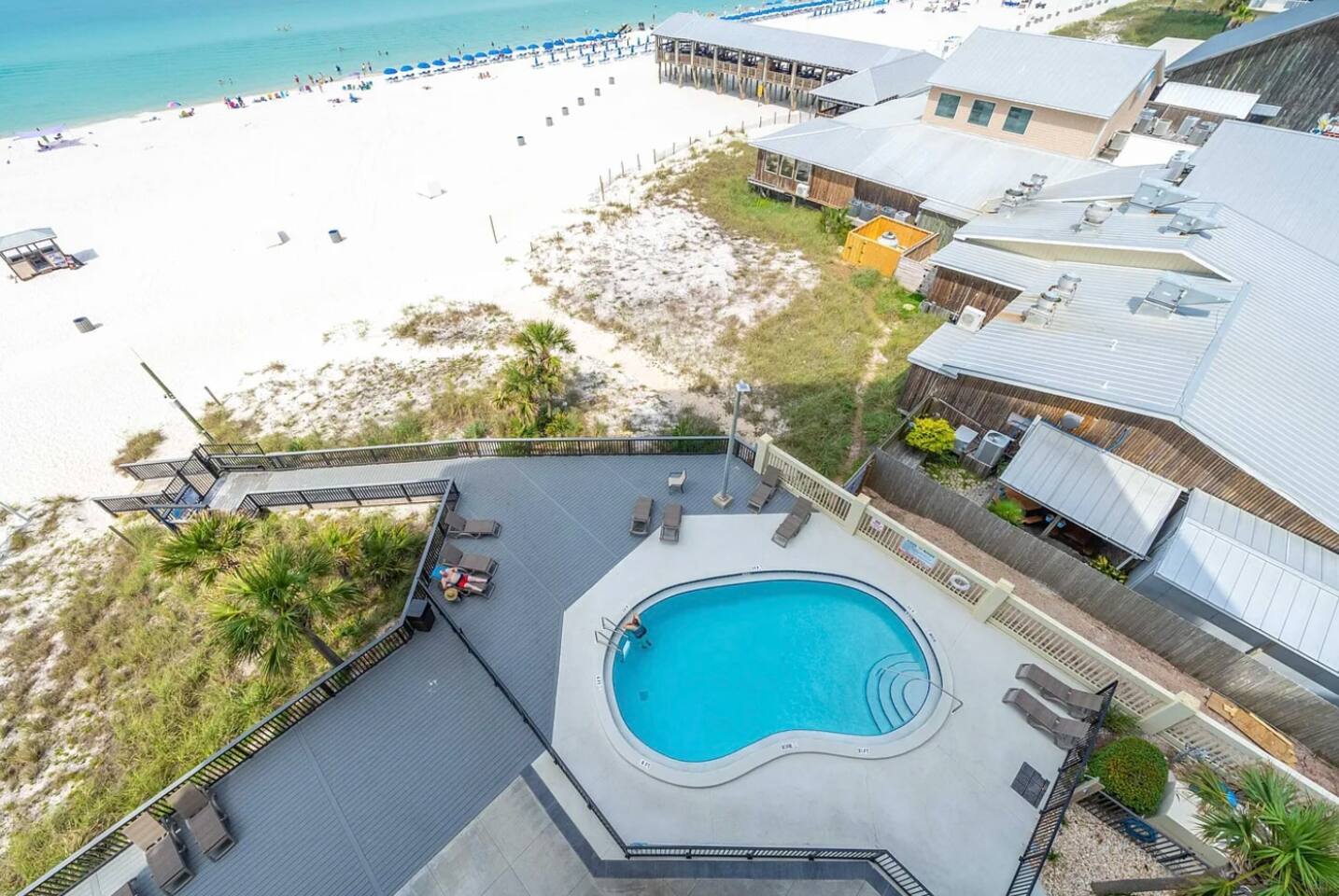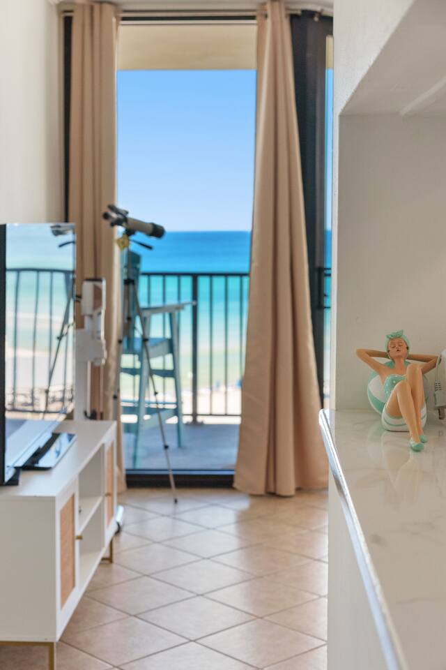 Beachfront with sweeping panoramic gulf views, this guest favorite condo is perfect for couples! Packed with amenities including balcony overlooking the beach, 3 oceanfront pools, pickleball, shuffleboard, fitness center. Guests love the convenient location, magnificent sunset views & proximity to Pineapple Willies's. You won't want to leave this cozy beach condo but you're in a prime location & only minutes away from great restaurants & attractions. ⚲ 0.5 mi: Walmart ⚲ 6.2 mi: Pier Park